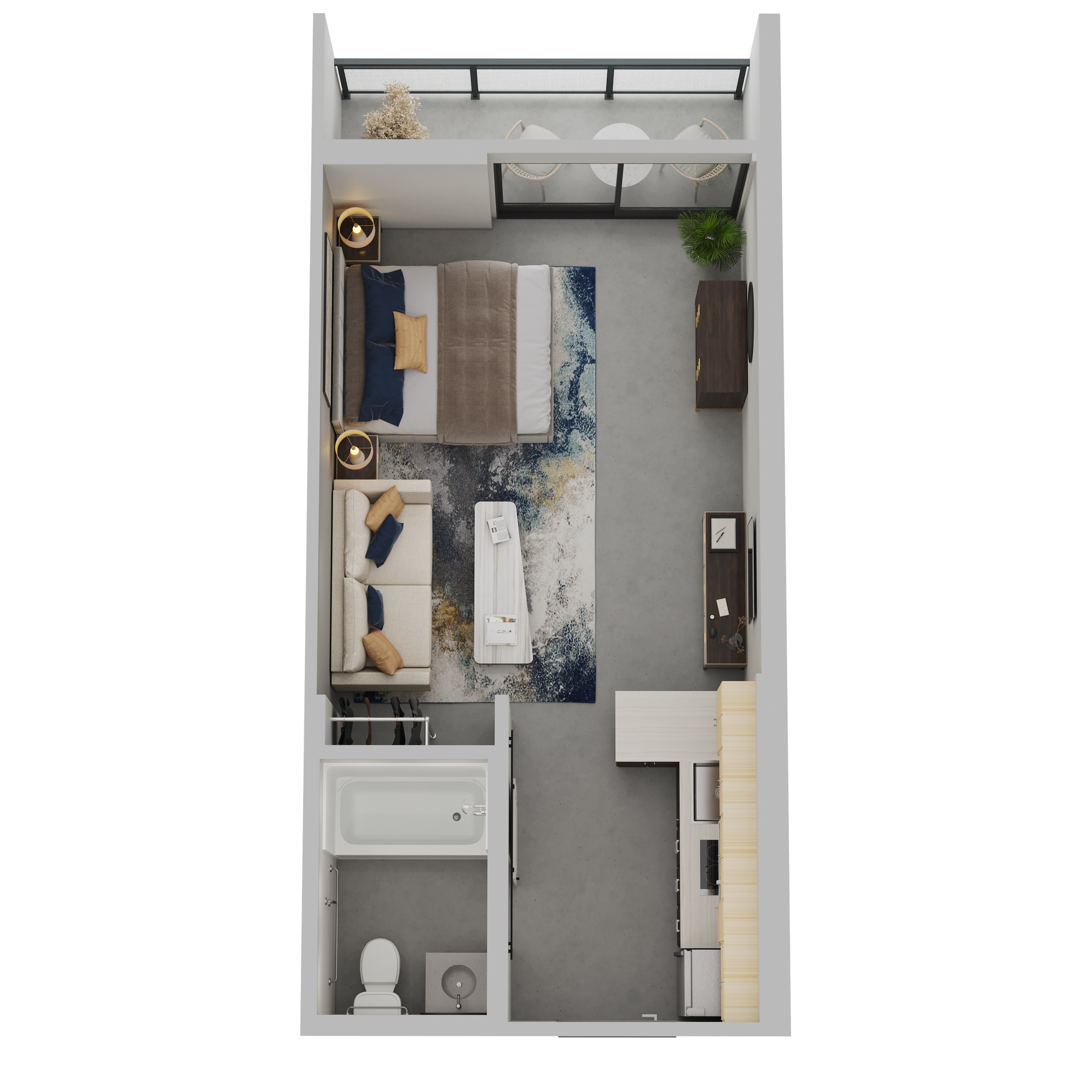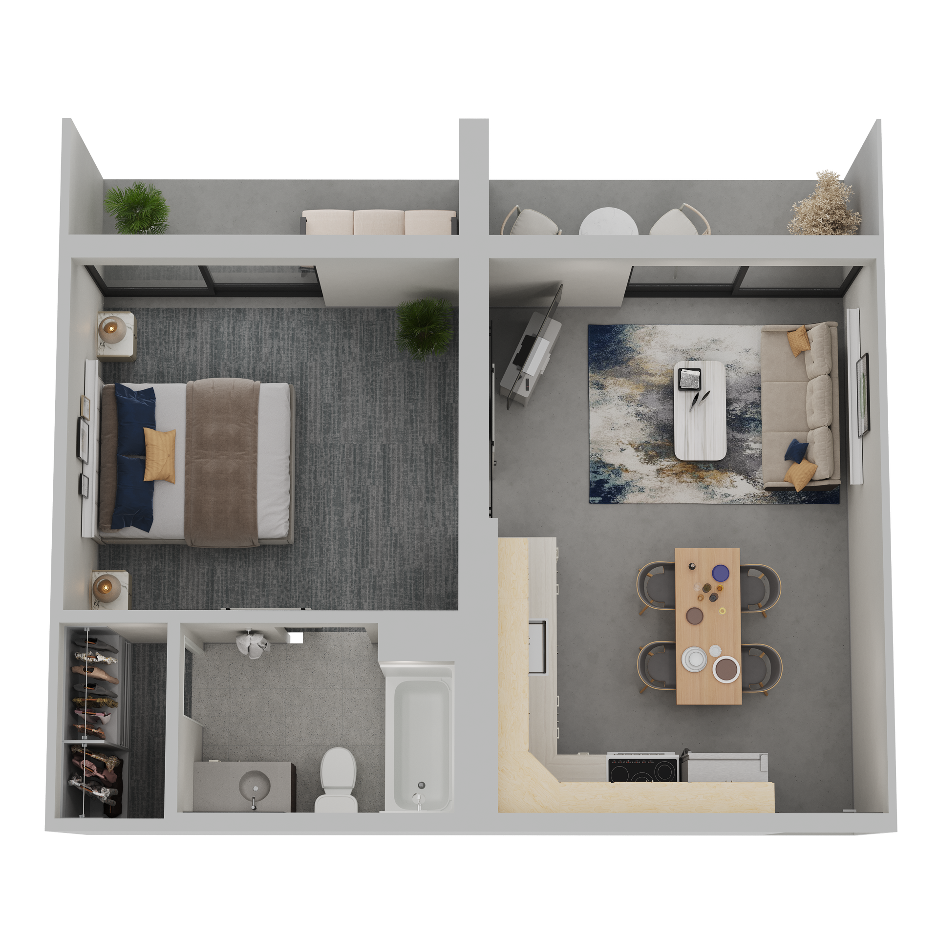 Each apartment blends sustainability and comfort, featuring durable concrete construction, stainless steel appliances, two-tone cabinetry, and unique LED lighting. Neutral tones and raw design elements give residents the flexibility to personalize their space.